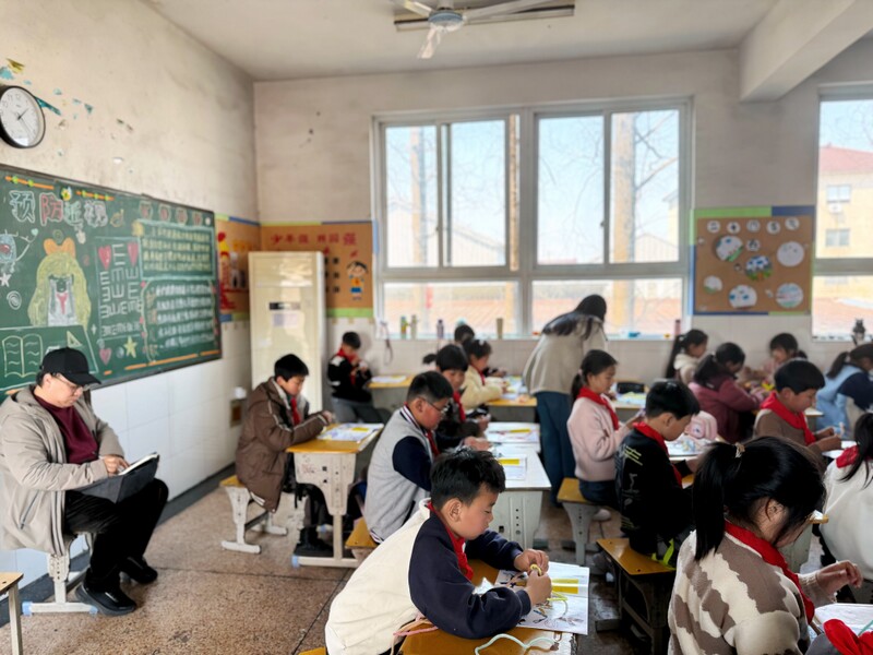 教研员王展鹏老师认真观察学生的创作过程,并建议在作品展示与评价环节,可进一步丰富评价方式,除教师评价外,增加学生自评与互评,让学生在交流中提升审美与表达能力;另外,在素材拓展方面,可引入一些不同文化背景下表现快乐的艺术作品,拓宽学生艺术视野,并留意他们对色彩、构图的运用和创意表达。