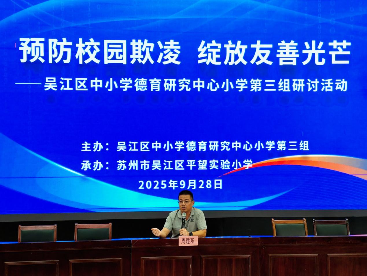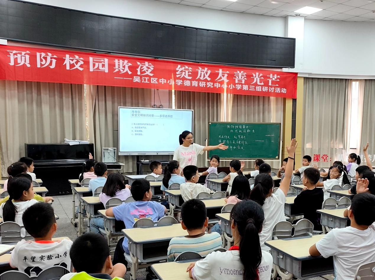为全面落实立德树人根本任务,提升学校德育工作质量,切实有效地增强学生的法治观念,提高学生抵制和防范校园欺凌的能力,创造安全和谐的学习环境,9月28日,吴江区中小学德育研究中心小学第三组以《预防校园欺凌 绽放友善光芒》为主题在平望实验小学开展了研讨活动。吴江区教育局普教科副科长周建东,区中小学德育研究中心小学第三组各成员校分管领导、各学校青年班主任参与了本次活动。