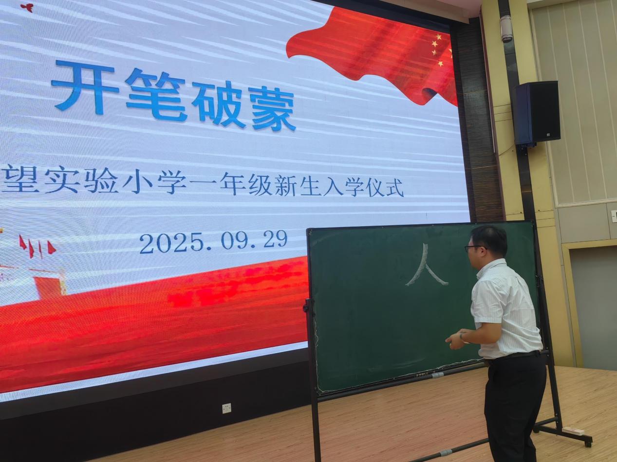 黄校长在黑板上郑重写下一个端端正正的“人”字,为新生进行开笔礼。这个简单而深远的汉字,寄托着学校希望孩子们首先学会做人的教育理念。随后,每班一名学生代表上台学写“人”字。