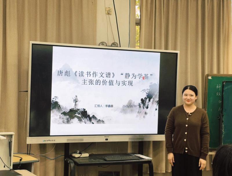本次读书会,我结合教学,从三方面分享唐彪《读书作文谱》“静为学基”主张的实践:其一明心,营造简洁温馨的物理环境,如班级用深蓝色卡纸布置以助学生静心;其二养性,教学生深呼吸、闭眼冥想,帮助学生养成静思习惯;其三澄理,写作教学前留8分钟“静坐”回忆细节,留“空白时间”让学生静读静思。“静”是给学生沉心时间,接下来的教学中,我会继续探索“静教”方法。