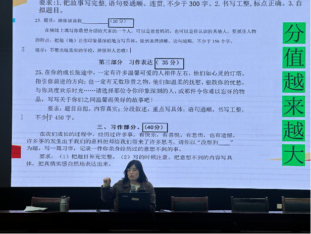最后,王洁主任围绕《作文教学有效性探讨》这一主题展开专题发言。她从作文教学的目标设定、教学方法创新、评价体系构建等方面进行了深入浅出的讲解,鼓励老师们通过多样化的教学手段激发学生的学习兴趣,提高作文教学的有效性。