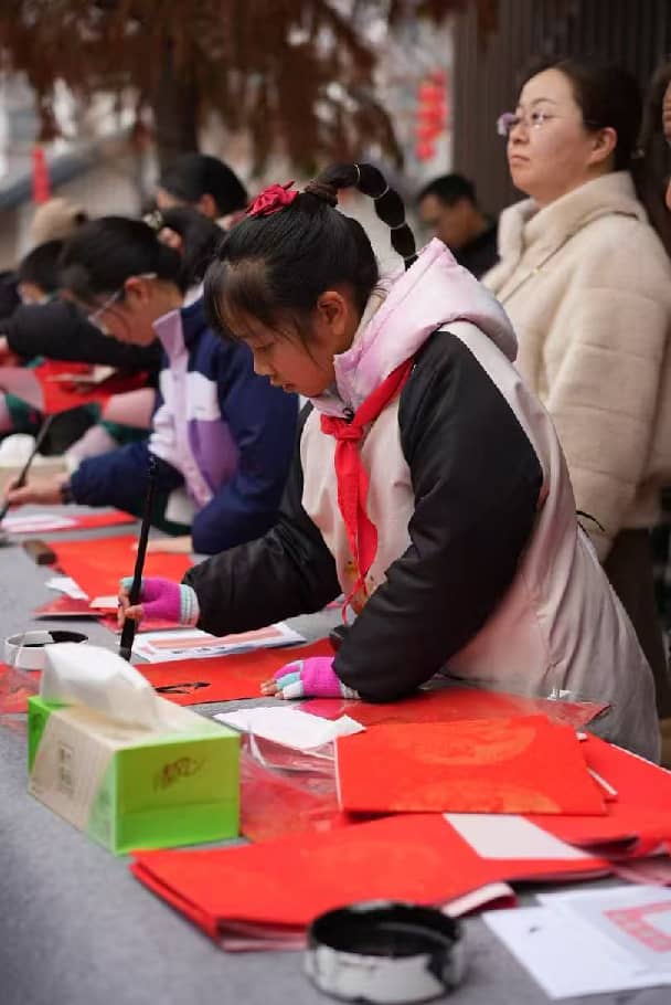 开幕式后,队员们兴致勃勃地投入到“笔墨迎春”送春联活动中。他们铺开红纸,凝神静气,挥毫泼墨。一个个饱满的“福”字、一副副寓意吉祥的春联在笔端流淌,虽显稚嫩,却笔笔认真,字字含情。