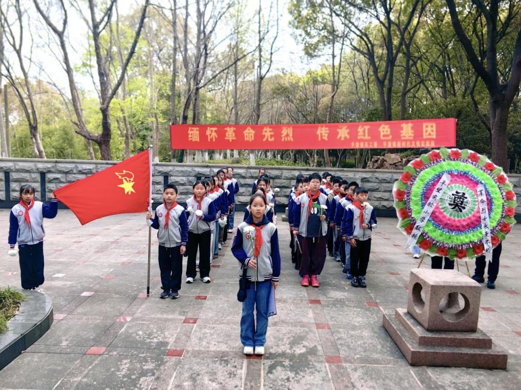 平望实验小学的少先队员们身着整洁的校服,胸前红领巾在春风中轻轻飘扬。他们怀着无比崇敬的心情,排着整齐的队伍,迈着庄重的步伐,来到松柏环抱、庄严肃穆的三野四烈士陵园。