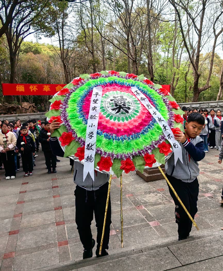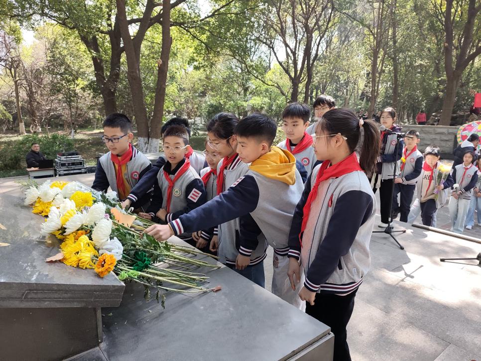 在纪念碑前,少先队员们整齐列队,肃立默哀。两名少先队员代表缓步上前,恭敬地向烈士敬献花圈,全体师生深深鞠躬,静默致哀。
